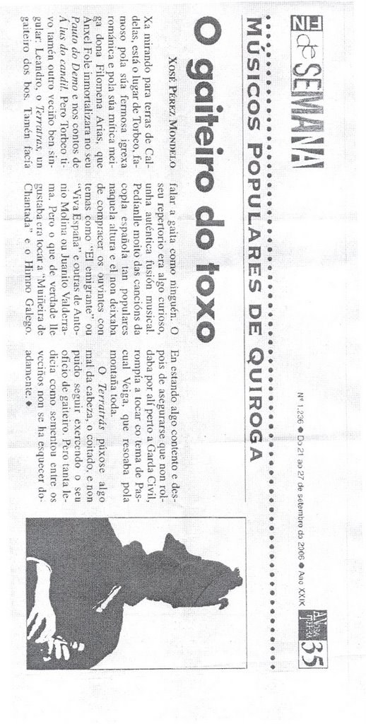 LEANDRO (O GAITEIRO DE TORBEO): Desde el periodico A NOSA TERRA el pasado 26 de Septiembre de este 2006 se hace una breve pero acertada reseña de LEANDRO, quien no recuerda algun agradable momento oyendole tocar la gaita?